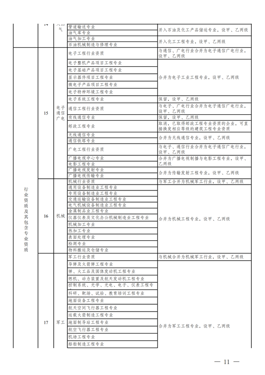 2.工程設(shè)計(jì)資質(zhì)。保留綜合資質(zhì);將21類行業(yè)資質(zhì)整合為14類行業(yè)資質(zhì);將151類專業(yè)資質(zhì)、8類專項(xiàng)資質(zhì)、3類事務(wù)所資質(zhì)整合為70類專業(yè)和事務(wù)所資質(zhì)。綜合資質(zhì)、事務(wù)所資質(zhì)不分等級;行業(yè)資質(zhì)、專業(yè)資質(zhì)等級原則上壓減為甲、乙兩級(部分資質(zhì)只設(shè)甲級)。