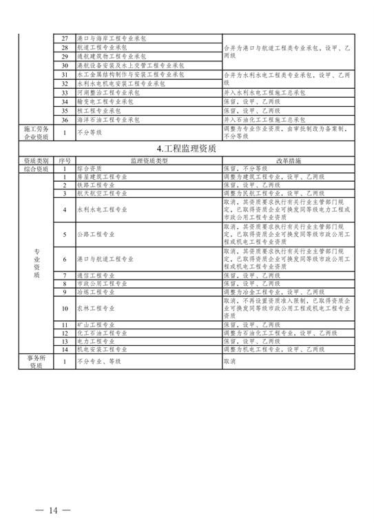4.工程監(jiān)理資質(zhì)。保留綜合資質(zhì);取消專業(yè)資質(zhì)中的水利水電工程、公路工程、港口與航道工程、農(nóng)林工程資質(zhì),保留其余10類專業(yè)資質(zhì);取消事務(wù)所資質(zhì)。綜合資質(zhì)不分等級,專業(yè)資質(zhì)等級壓減為甲、乙兩級。