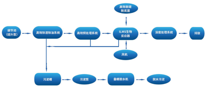 ILMS工藝是以ILMS高效生物反應(yīng)器為核心處理單元,通過前端高效物化預(yù)處理和尾端深度凈化實(shí)現(xiàn)垃圾中轉(zhuǎn)站壓濾液的達(dá)標(biāo)排放,該工藝流程圖如下:
